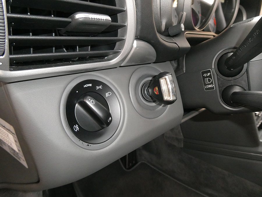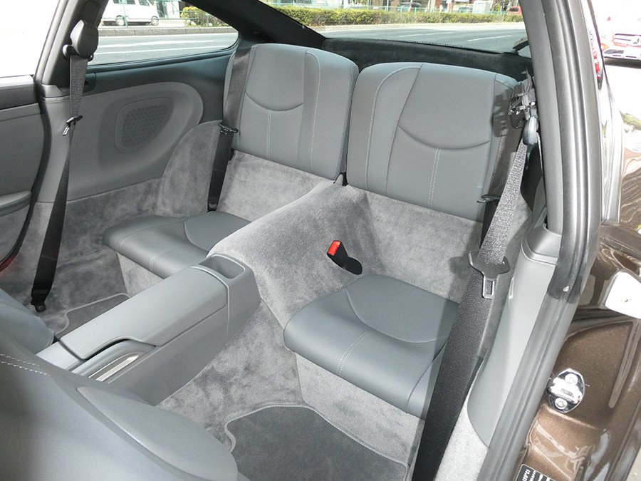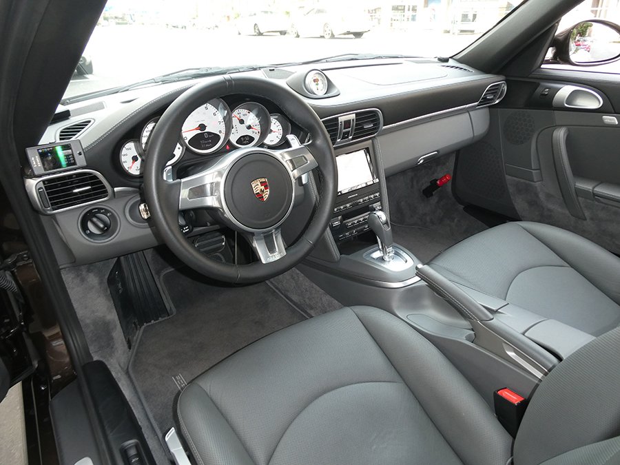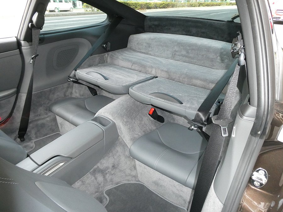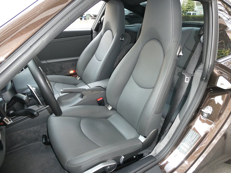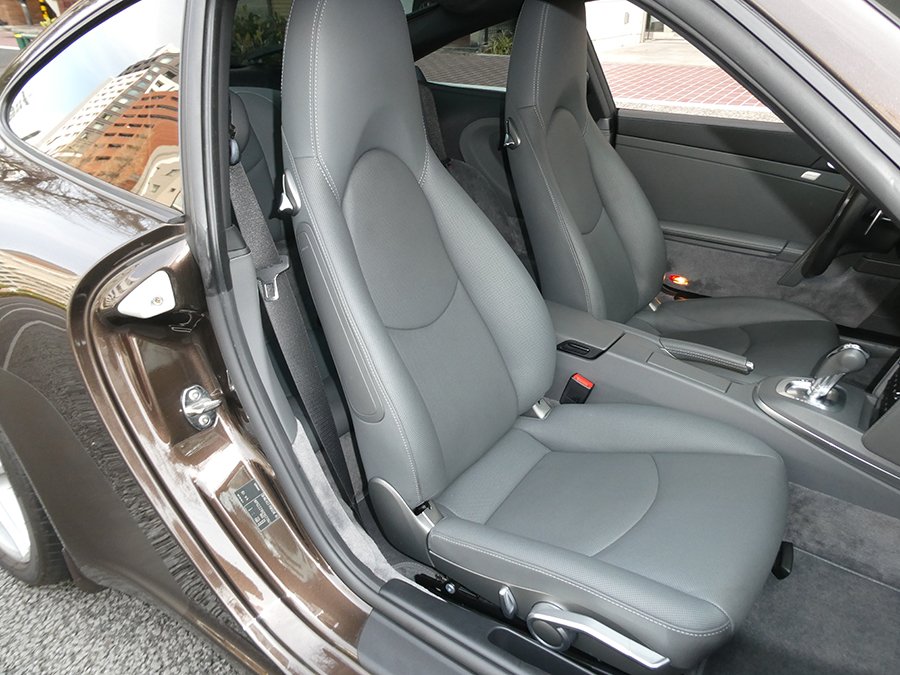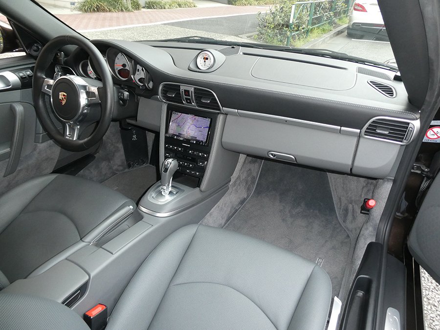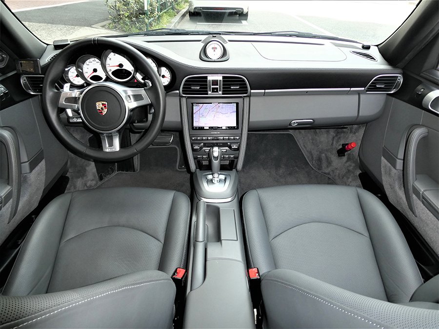 なんといってもオプションカラーの『マカダミアメタリック』のエクステリアカラーに萌えます。そしてインテリアカラーもブラックとグレーのツートンコンビオールレザーインテリアなのです。この色の組み合わせは数ある997の中でも特別な1台といえます。